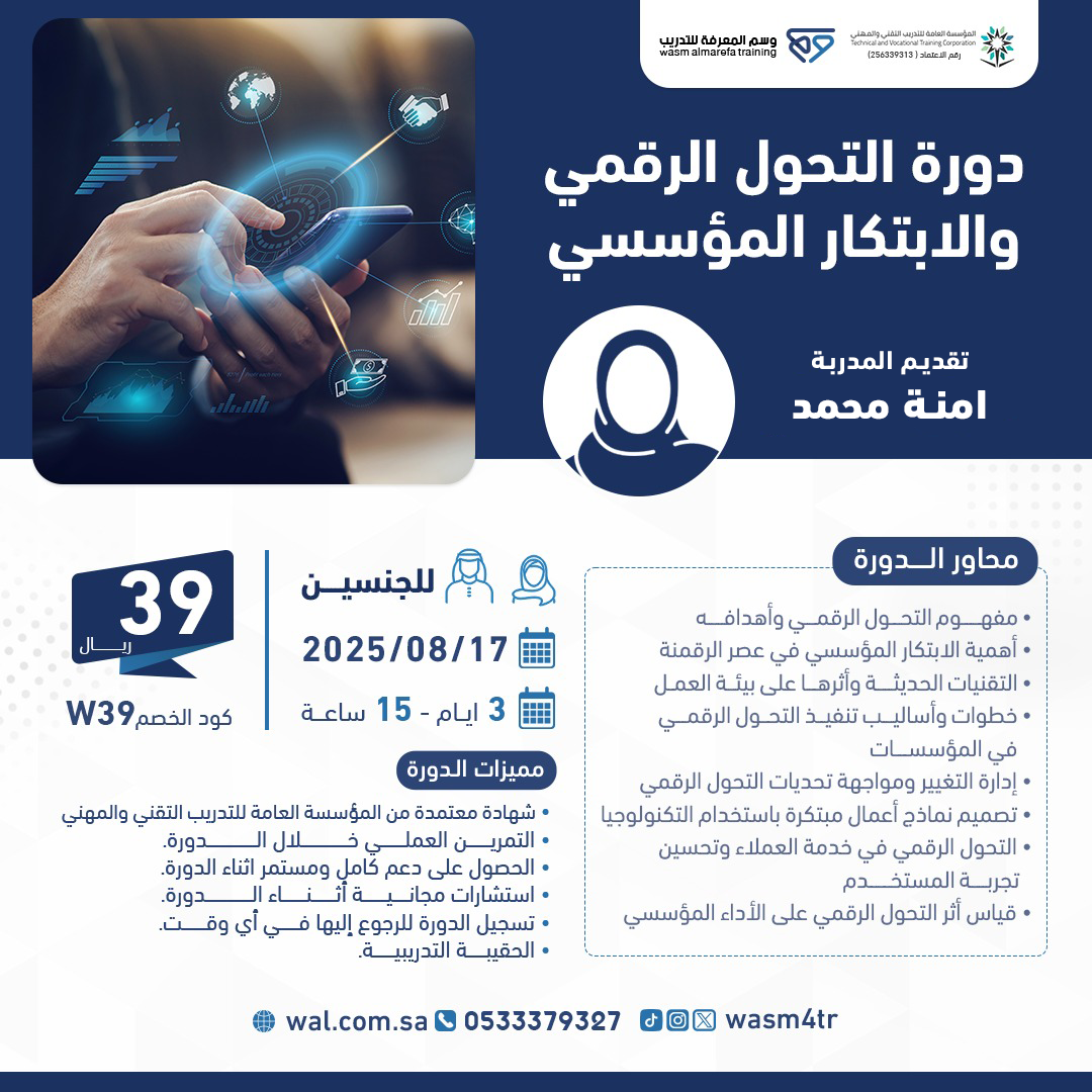 دورة “التحول الرقمي والابتكار المؤسسي” تهدف إلى تزويد المشاركين بفهم شامل للتقنيات الحديثة وكيفية تطبيقها في تحسين العمليات المؤسسية. تركز الدورة على استراتيجيات التحول الرقمي ودور الابتكار في تعزيز كفاءة المؤسسات. كما تستعرض كيفية استخدام أدوات وتقنيات جديدة لتحقيق التنافسية والنمو المستدام. في نهاية الدورة، سيكون المشاركون قادرين على قيادة مبادرات التحول الرقمي داخل مؤسساتهم.