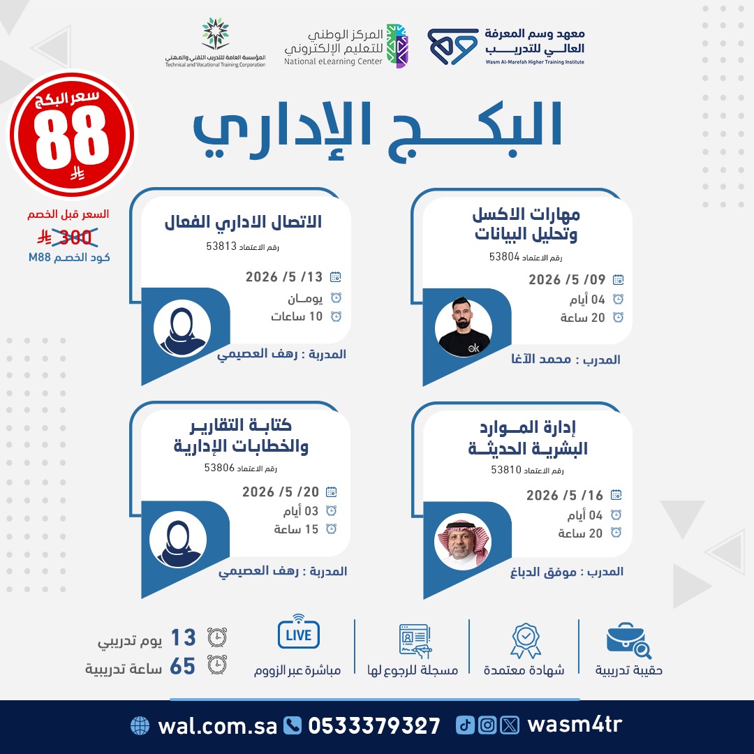 البكج الإداري هو برنامج تدريبي متكامل يهدف إلى تطوير المهارات الإدارية والقيادية للمشاركين. سيتعلم المشاركون مهارات الاتصال الإداري الفعال لتعزيز التواصل داخل المؤسسات، وإدارة الموارد البشرية الحديثة لتخطيط وتوظيف وتحفيز الموظفين. كما يكتسبون مهارات التخطيط المالي وإدارة الميزانيات لمتابعة الأداء المالي، إلى جانب كتابة التقارير والخطابات الإدارية بشكل احترافي لدعم اتخاذ القرار وتحسين كفاءة العمل الإداري.