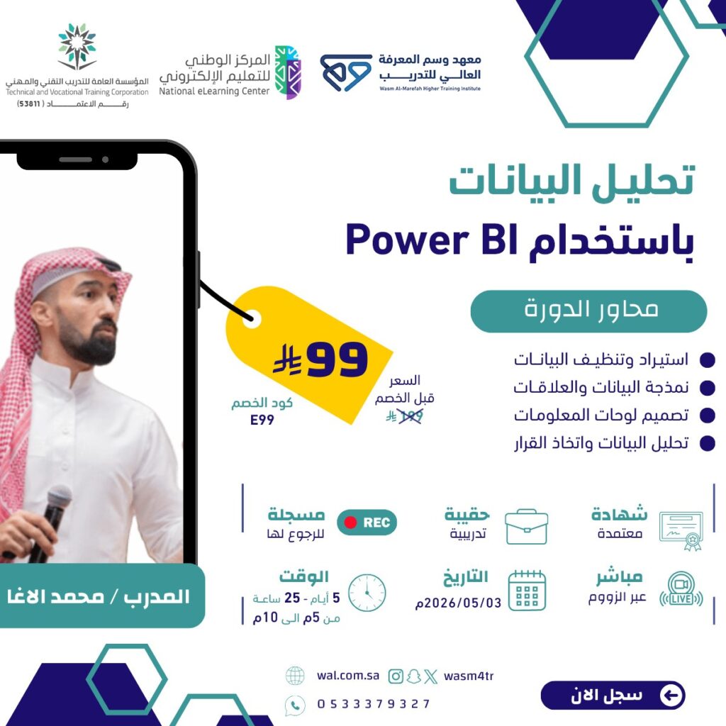 تركز الدورة على استخدام أدوات Power BI في تحليل البيانات وبناء لوحات المعلومات التفاعلية، وتمكين المتدرب من دعم القرار عبر تقارير احترافية.