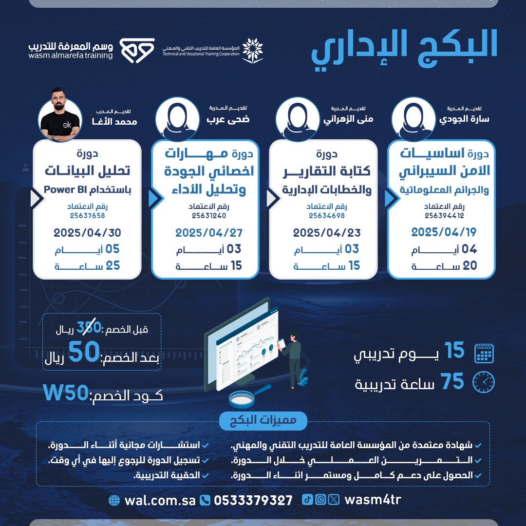 تم تصميم “البكج الإداري” الذي يقدّم لك مجموعة دورات تدريبية متكاملة على مدى 15 يومًا بواقع 75 ساعة تدريبية تؤهلك لسوق العمل. يشمل البكج دورات في “أساسيات الأمن السيبراني والجرائم المعلوماتية” لتعزيز الوعي بحماية البيانات وحل التهديدات الإلكترونية. بالإضافة إلى دورة “كتابة التقارير والخطابات الإدارية” التي تركز على تحسين مهارات الكتابة الإدارية والتواصل المؤسسي. كما يحتوي البكج على دورة “مهارات أخصائي الجودة وتحليل الأداء” لتطوير مهارات تحسين العمليات وقياس الأداء. أخيرًا، يتضمن البكج دورة “تحليل البيانات باستخدام Power BI” التي تعزز مهارات تحليل البيانات وتقديم الرؤى عبر تقارير تفاعلية.